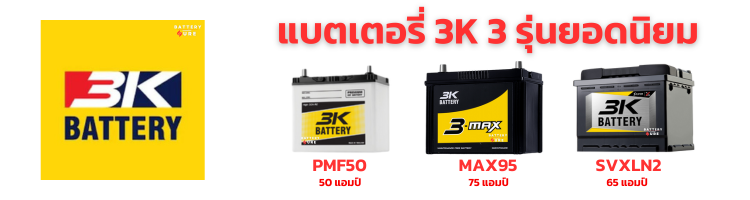 แบตเตอรี่รถ 3K ยี่ห้ออันดับ ต้นๆในไทย จำหน่ายมาอย่างยาวนาน ทนทาน แรงสตาร์ทสูง อายุการใช้งานยาวนาน ราคาประหยัด แนะนำแบตเตอรี่ 3K มี 3 รุ่นยอดนิยม ดังนี้